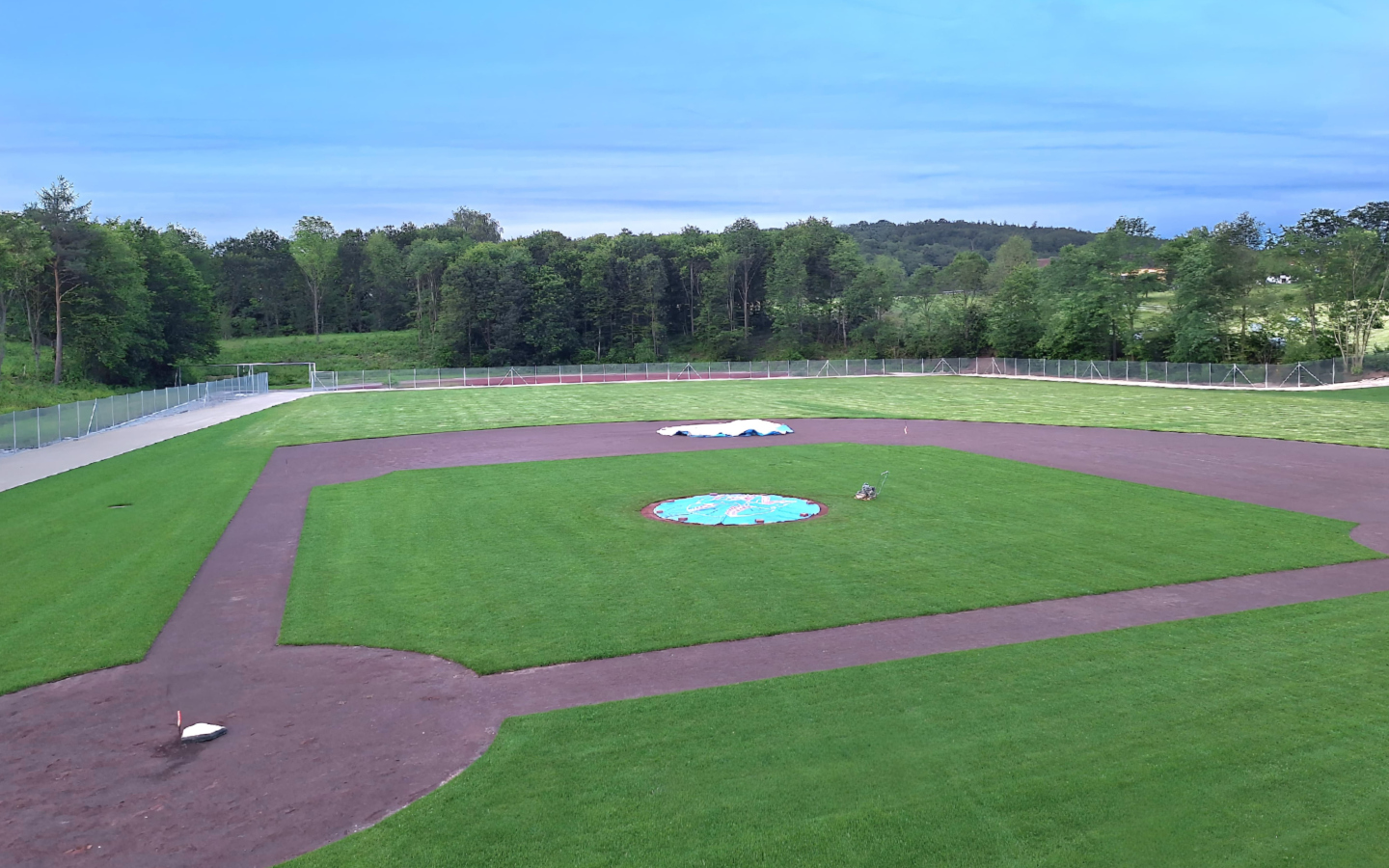 Fast fertig: Das Spielfeld des neuen Hungerberg Ballparks lässt sich unschwer als Bereicherung in der Ellwanger Sportlandschaft einordnen. Während rund um das Feld und in den Servicebereichen auch künftig noch viel Eigenleistung nötig sein wird, kann das Feld am Sonntag bei der Premiere gegen BBA Regensburg nun endlich bespielt werden. (Foto: Lena Riethmüller)