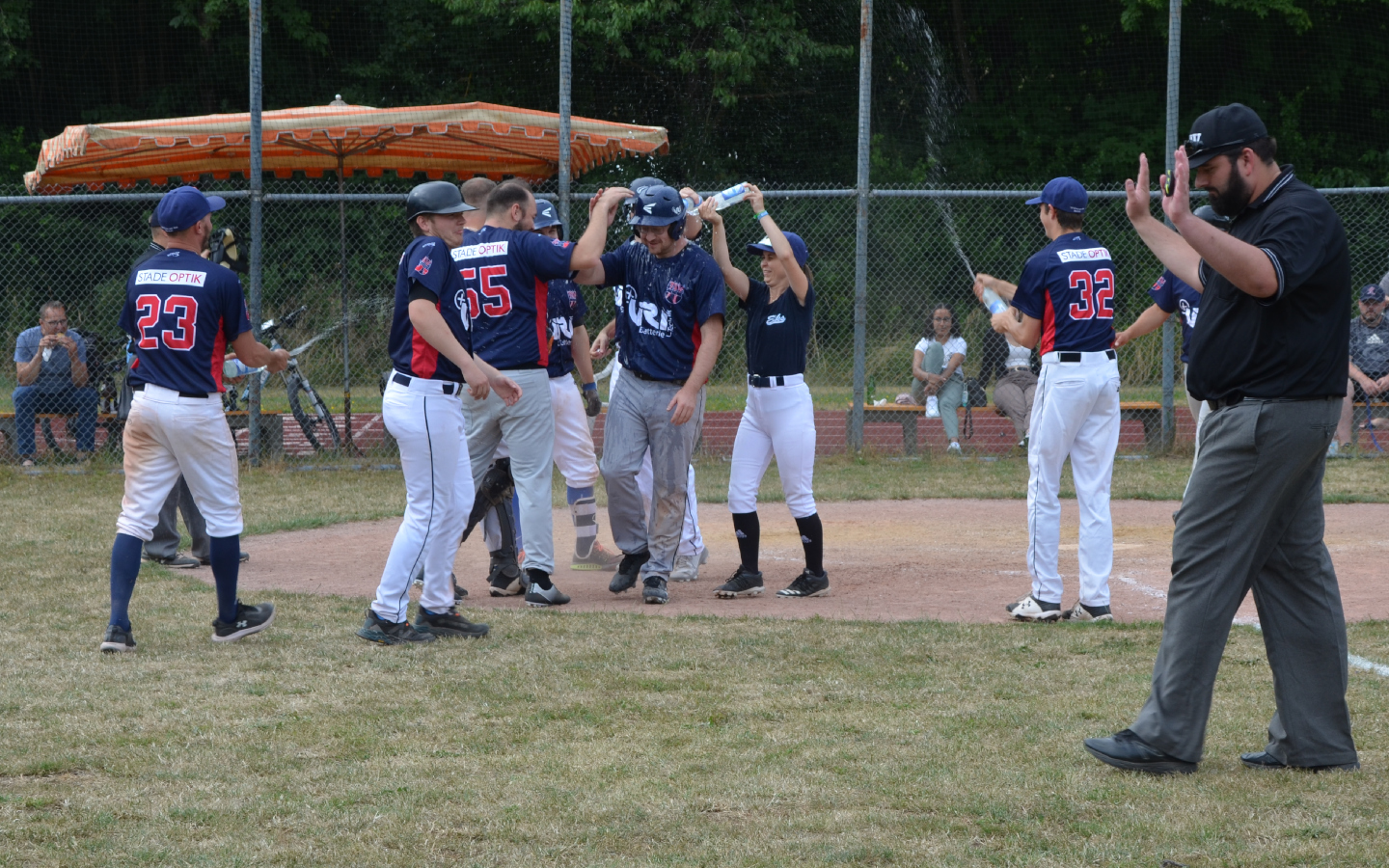 So muss das: Mike Tauporn wird nach seinem Walk-Off-Homerun zur Beendigung der Partie von seinen Teammates ordentlich gefeiert. (Foto: Rainer Schiele)